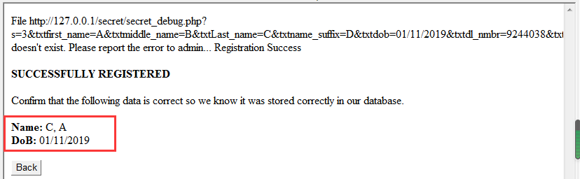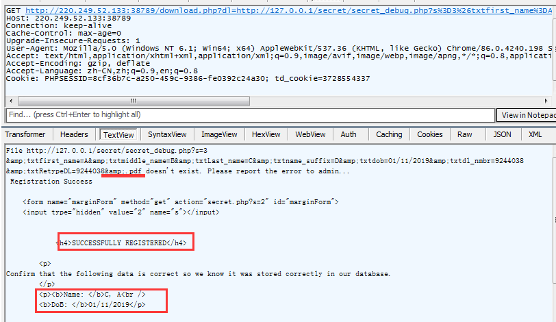 http://220.249.52.133:38789/download.php?dl=http://127.0.0.1/secret/secret_debug.php?s%3D3%26txtfirst_name%3DA%26txtmiddle_name%3DB%26txtLast_name%3DC%26txtname_suffix%3DD%26txtdob%3D01%2F11%2F2019%26txtdl_nmbr%3D9244038%26txtRetypeDL%3D9244038%26
