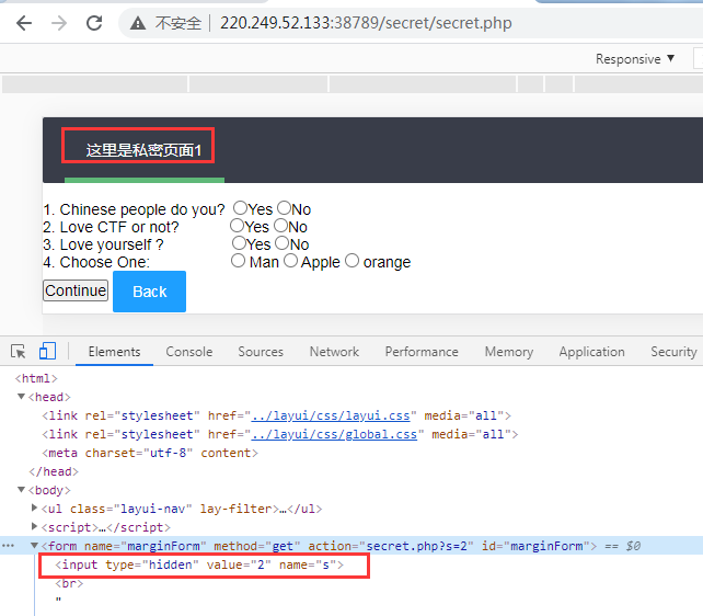 访问secret.php文件时,显示如下,页面提示“这里是私密页面1”,猜想还有私密页面2。查看页面元素,发现页面中有一个隐藏参数s,默认值为2