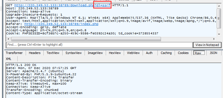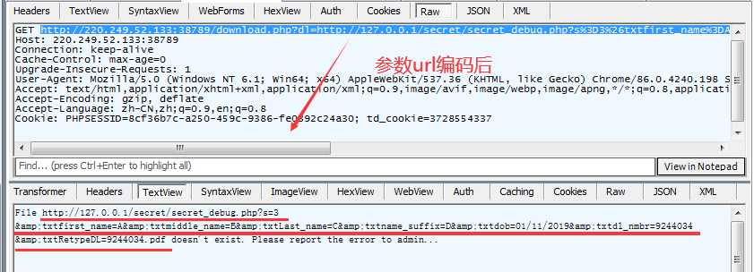 由于你的url形式是ip:port/download.php?dl=http://127.0.0.1/secret/secret_debug.php?s=3&txtfirst_name=…….这样会导致在第一个&符号处被加上.pdf导致其余参数无法传入debug文件里面(如上图所示),所以这里要给特殊字符url编码一次再请求,apache服务器就会自动解密一次,这样.pdf就会加在最后一个参数后面了(如下图所示)。