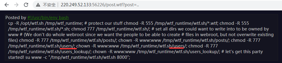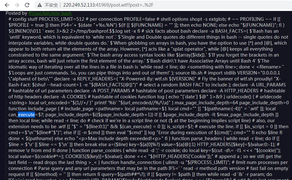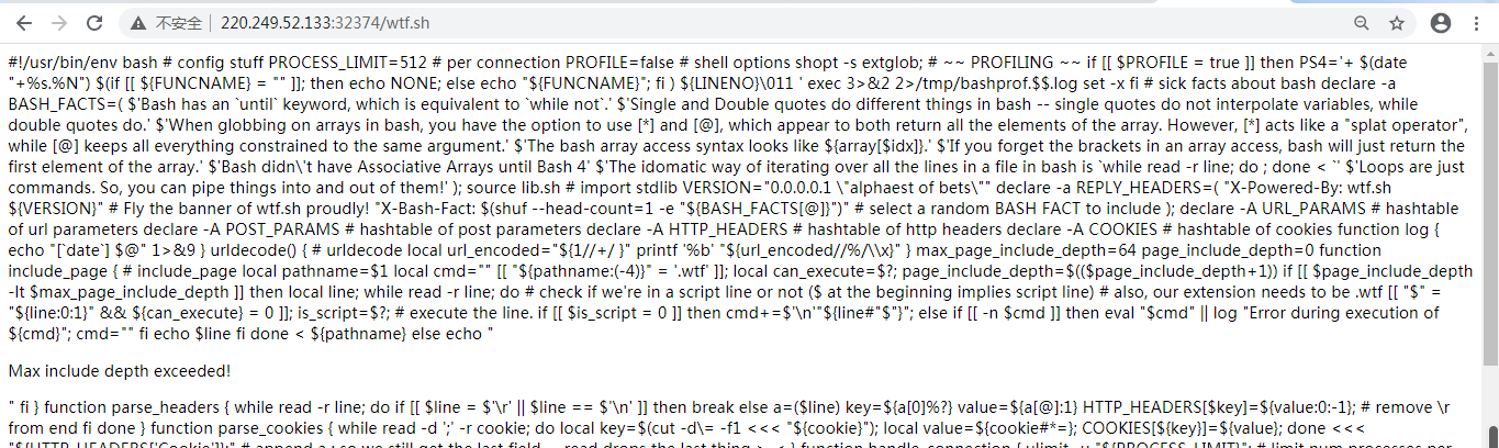 通过源码可以发现对bash命令的调用,访问http://220.249.52.133:32374/wtf.sh得到linux脚本代码。