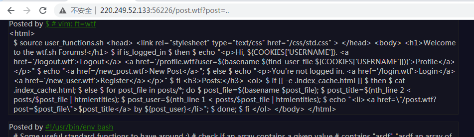 进入环境, 在展示文章的页面 post.wtf 下发现路径穿越漏洞,可以获得网站源码