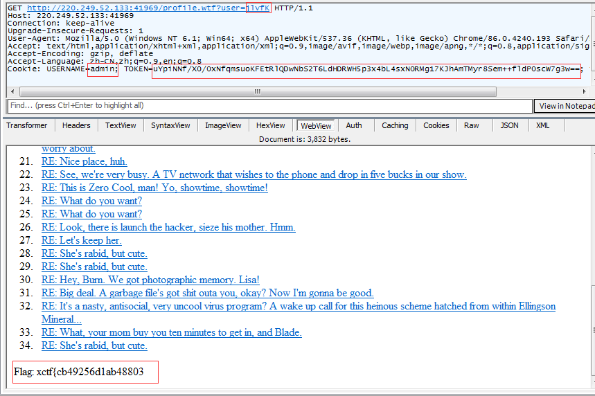 发现自己注册的账号以及 admin 都被显示了出来,对比之前的 cookie,发现这个就是TOKEN的值。
