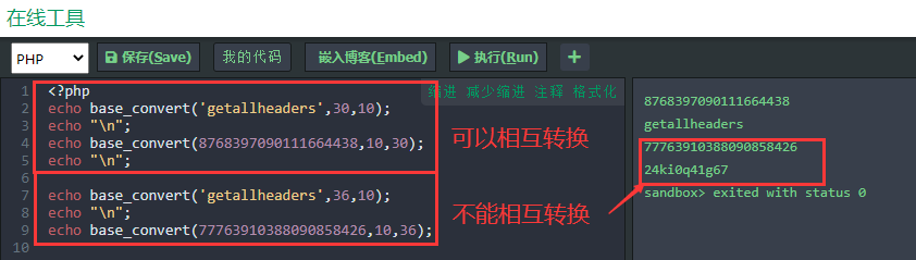 最后看了writeup发现在众多函数中有个base_convert()函数,这个才是解题的关键。