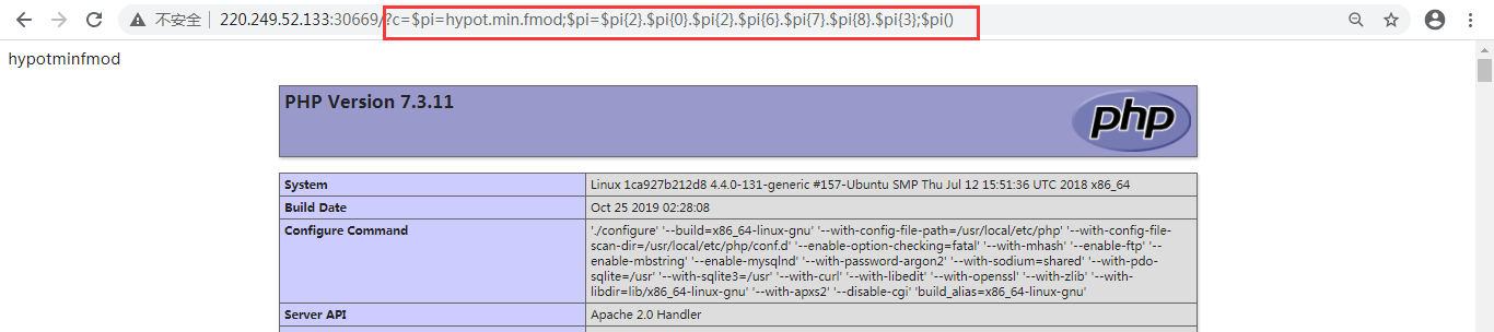 - 首先定义一个变量名$pi,因为pi在白名单中且长度最短,其值为hypot.min.fmod,因为hypot、min、fmod均在白名单中,而且phpinfo中的所有字符均可以在其中找到;