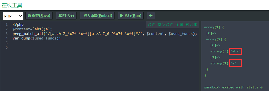 - abs()a,匹配出abs和a,a不在白名单中,不能过