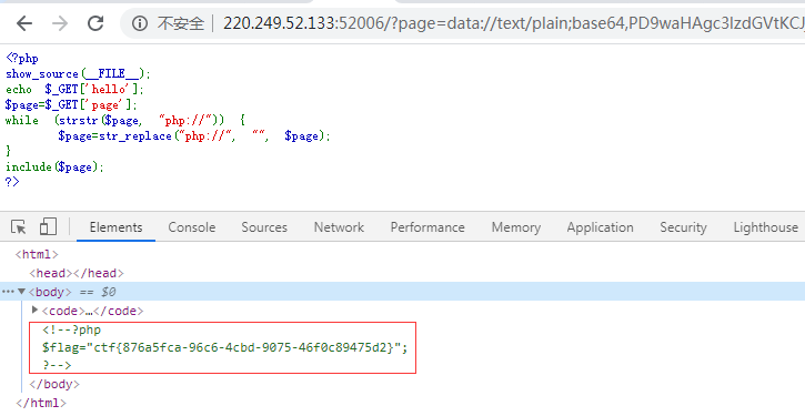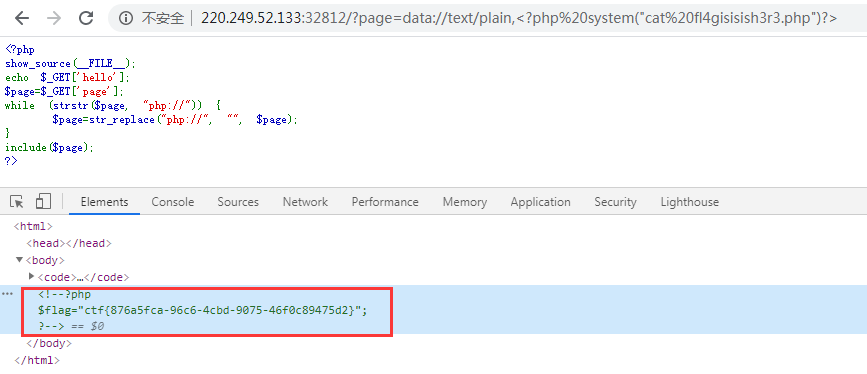既然过滤了php://的伪协议,我们可以使用其他协议,这里使用data://伪协议。