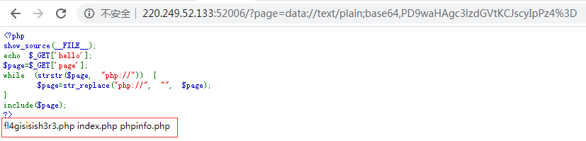 <?php show_source(__FILE__); echo $_GET['hello']; $page=$_GET['page']; while (strstr($page, "php://")) { $page=str_replace("php://", "", $page); } include($page); ?>