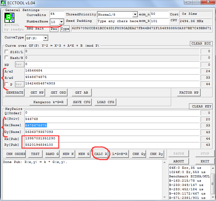 已知椭圆曲线加密Ep(a,b)参数为 p = 15424654874903 a = 16546484 b = 4548674875 G(6478678675,5636379357093) 私钥为 k = 546768 求公钥K(x,y)