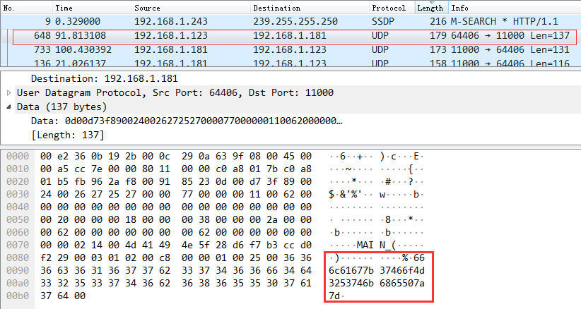 用wireshark打开流量包,发现存在关于ARP、UDP、SNA协议的流量包,仔细分析后发现大量的UDP包大小都一样,只有少量的是不同的,一个一个找下去,发现如下包有异常字符: