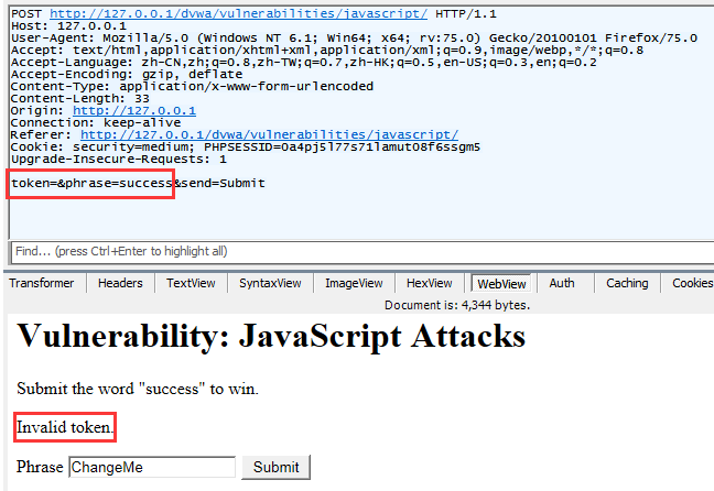 首先我们输入success,点击submit,页面返回“Invalid token.”
