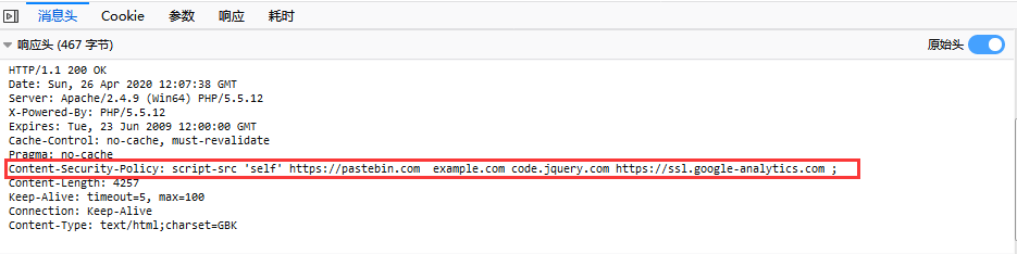 通过抓包,也能观察到返回的报文中CSP的内容