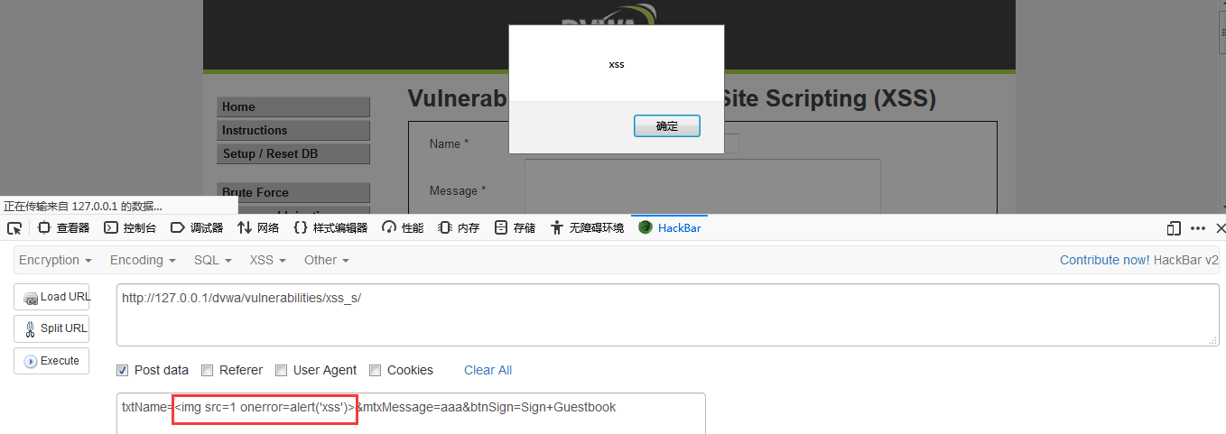 抓包,将name参数值改为<img src=1 onerror=alert(‘xss’)>。,成功弹框