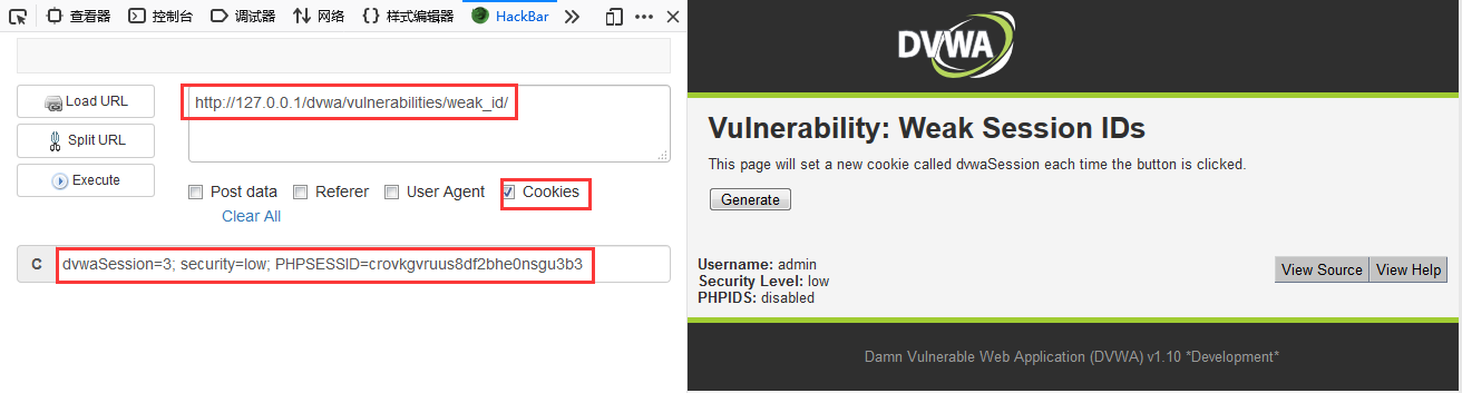 dvwaSession就是生成的需要测试的SessionID,PHPSESSID是在访问时服务器分配给我的,不是用来测试的。
