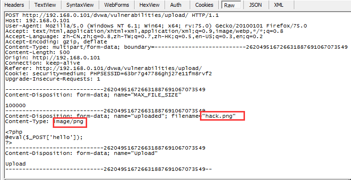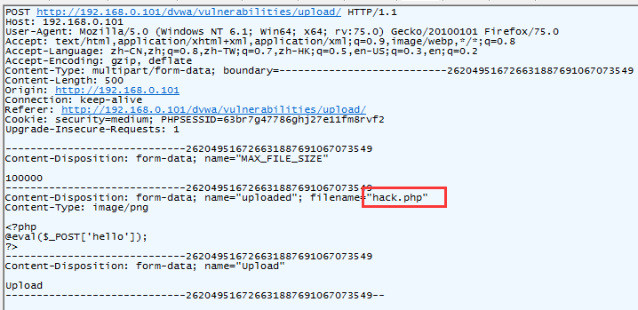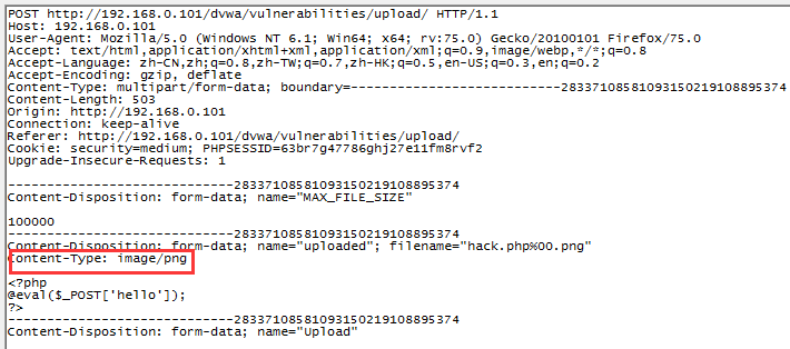 可以看到文件类型为image/png,尝试修改filename为hack.php