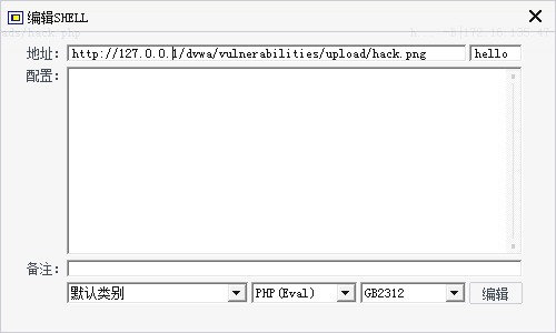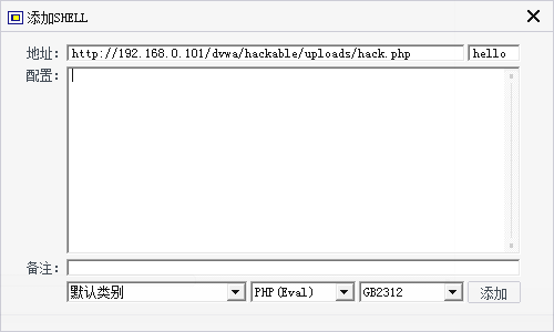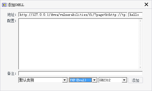 那么如何让服务器将其解析为php文件呢?我们想到文件包含漏洞。这里可以借助Medium级别的文件包含漏洞来获取webshell权限,打开中国菜刀,右键添加,在地址栏中输入