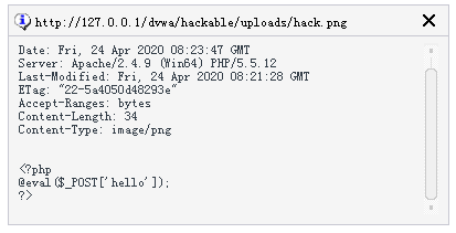 因为采用的是一句话木马,所以文件大小不会有问题,至于文件类型的检查,尝试修改文件名为hack.png。