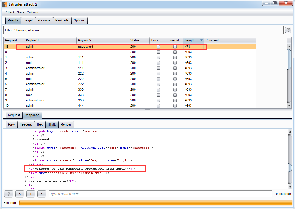 与Low Level中的方法一相同,不再赘述。另外,如果要用户名密码一起爆破,可以将攻击类型改为cluster bomb模式。